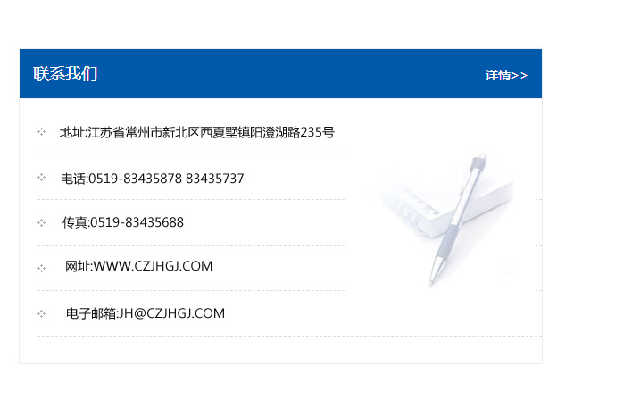 地址:常州市新北區友邦商務大廈1幢16、17層  電話:0519-85101652  傳真:0519-85112595  郵編:213022  網址:www_cz-jiayue_cn.bjsoway.com  郵箱:xiajifengaa@163.com